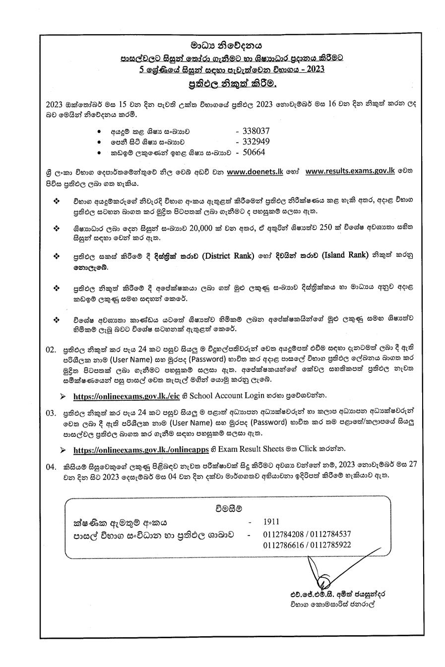 2023 5 ශ්රේණිය ශිෂ්යත්ව විභාගයේ ප්රතිඵල විභාග දෙපාර්තමේන්තුව විසින් නිකුත් කර ඇත.
