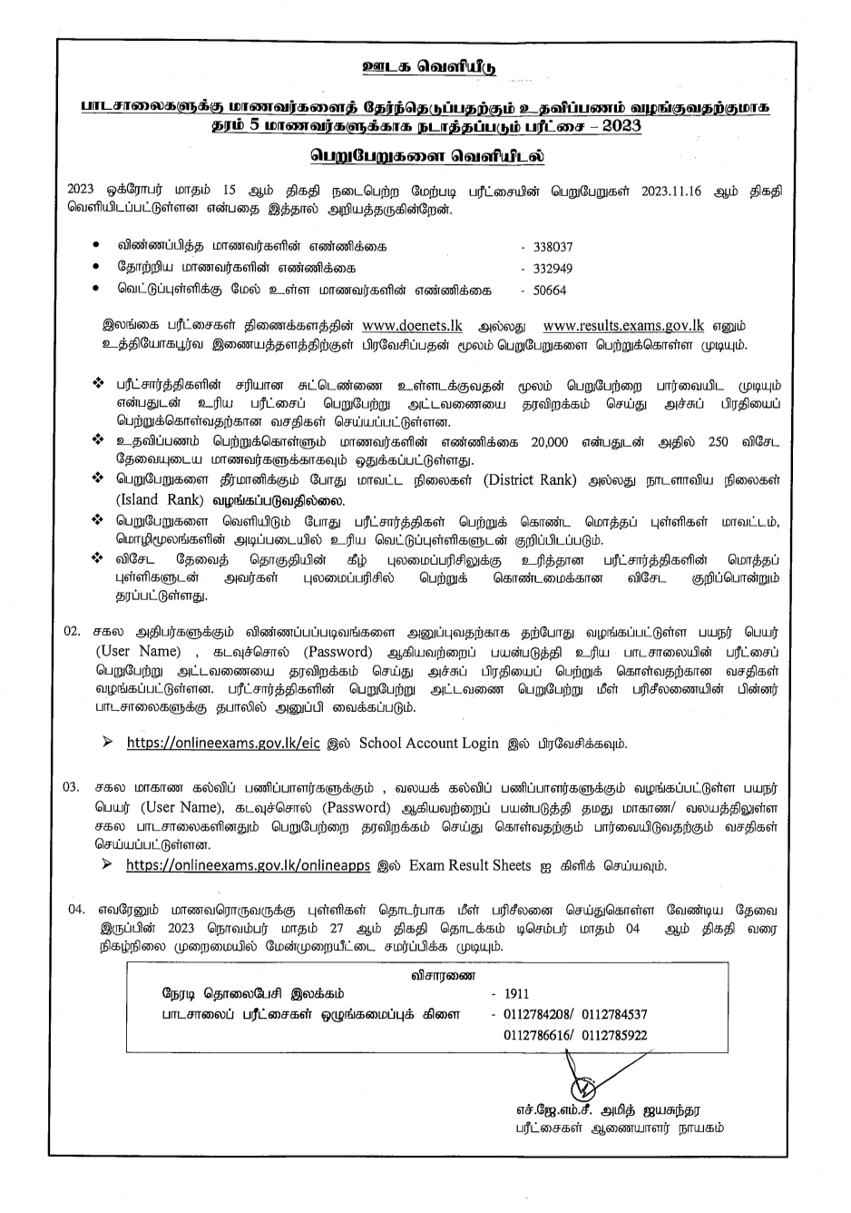 2023 ඔක්තෝම්බර් මස 15 වන දින පැවති 05 ශ්රේණිය ශිෂ්යත්ව විභාගයේ (2023) ප්රතිඵල විභාග දෙපාර්තමේන්තුව විසින් නිකුත් කර ඇත.