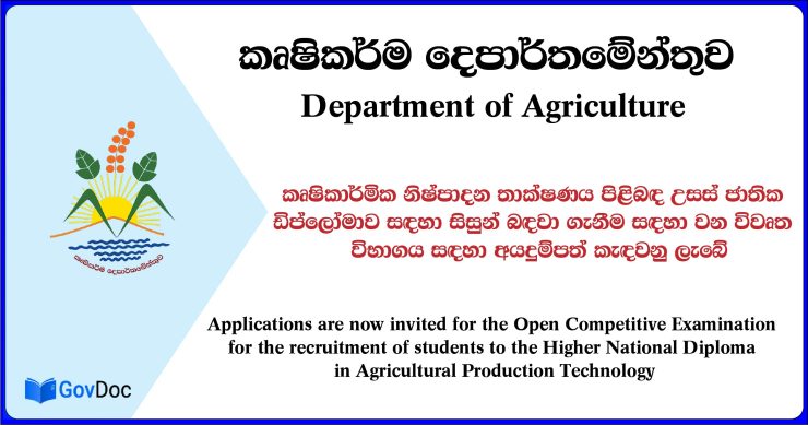 කෘෂිකාර්මික නිෂ්පාදන තාක්ෂණය පිළිබඳ උසස් ජාතික ඩිප්ලෝමාව සඳහා සිසුන් ඇතුළත් කර ගැනීම සඳහා වන විවෘත තරඟකාරී විභාගය සඳහා අයදුම්පත් දැන් කැඳවනු ලැබේ