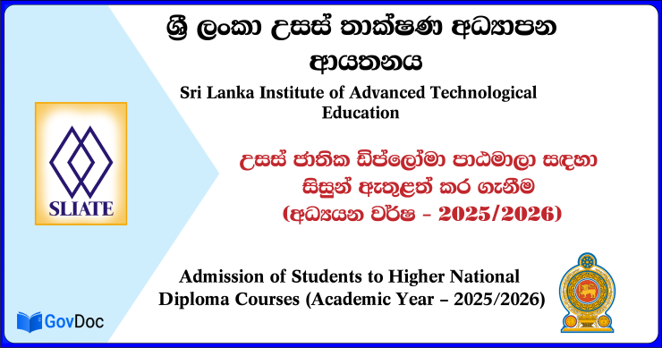 අධ්‍යාපන අමාත්‍යාංශයේ ශ්‍රී ලංකා උසස් තාක්ෂණ අධ්‍යාපන ආයතනය (SLIATE) විසින් පවත්වනු ලබන උසස් ජාතික ඩිප්ලෝමා (HND) පාඨමාලා (අධ්‍යයන වර්ෂය – 2025/2026) සඳහා සිසුන් ඇතුළත් කර ගැනීම සඳහා අයදුම්පත් කැඳවීම.