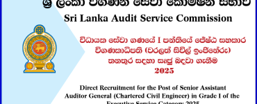 ශ්රී ලංකා රාජ්ය විගණන සේවයේ විධායක සේවා ගණයේ ජේෂ්ඨ සහකාර විගණකාධිපති තනතුර සදහා සෘජු බදවා ගැනීම 2025. 3 months agoAdd comment