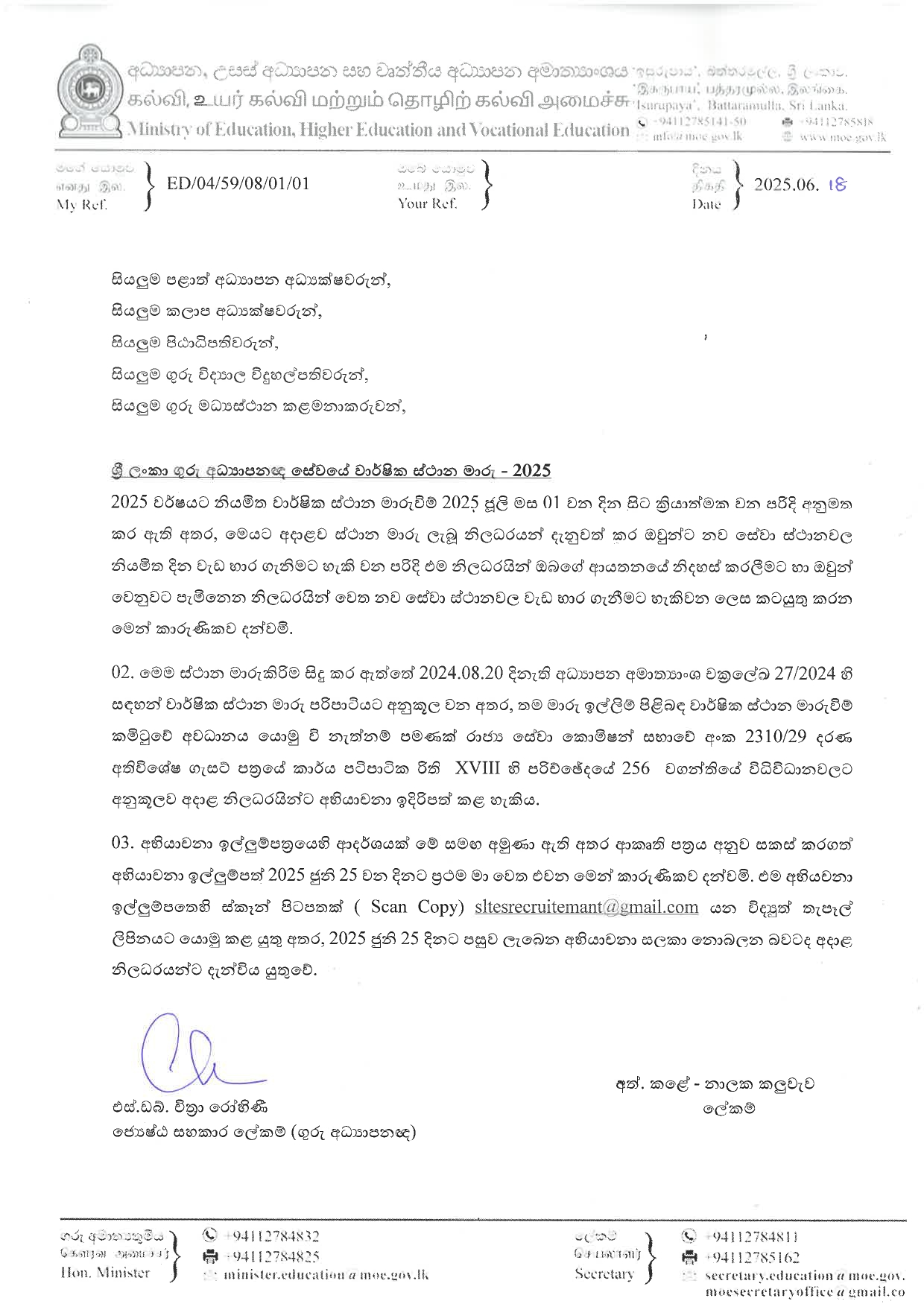 ශ්රී ලංකා ගුරු අධ්යාපනඥ සේවයේ වාර්ෂික ස්ථාන මාරු – 2025