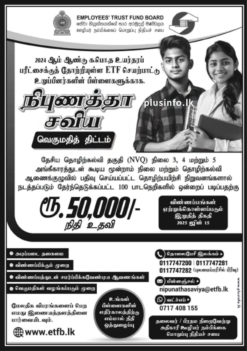 සේවක භාර අරමුදල් මණ්ඩලය (ETFB) – මුදල්, සැලසුම් සහ ආර්ථික සංවර්ධන අමාත්යාංශය 2024 (2025) අ.පො.ස. උසස් පෙළ (උසස් පෙළ) විභාගයට පෙනී සිටි සිසුන් සඳහා වෘත්තීය පුහුණු පාඨමාලාව හැදෑරීම සඳහා නිපුණතා සවිය ශිෂ්යත්ව සඳහා අයදුම්පත.