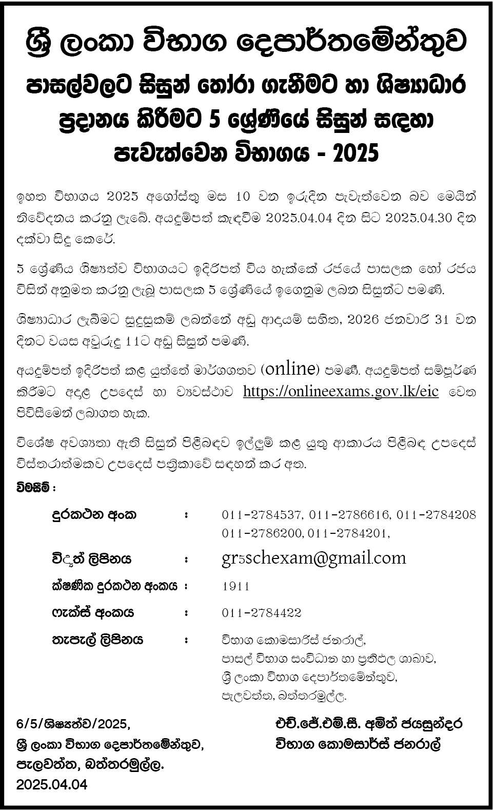 2025 05 ශ්රේණිය ශිෂ්යත්ව විභාගය සඳහා අයදුම්පත් කැඳවීම