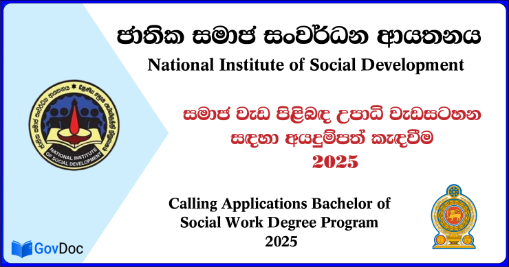 ජාතික සමාජ සංවර්ධන ආයතනය (NISD) විසින් පවත්වනු ලබන සමාජ වැඩ පිළිබඳ උපාධිය (BSW) ගෞරව උපාධි වැඩසටහන (අධ්යයන වර්ෂය 2025/2026) සඳහා අයදුම්පත් කැඳවීම.