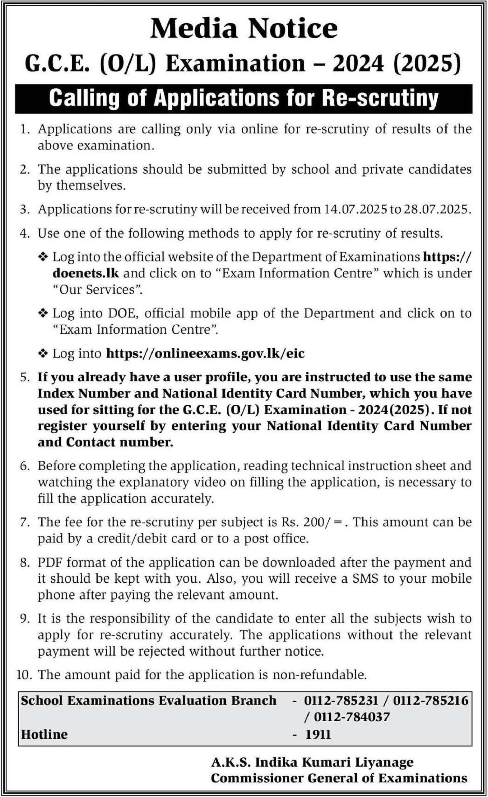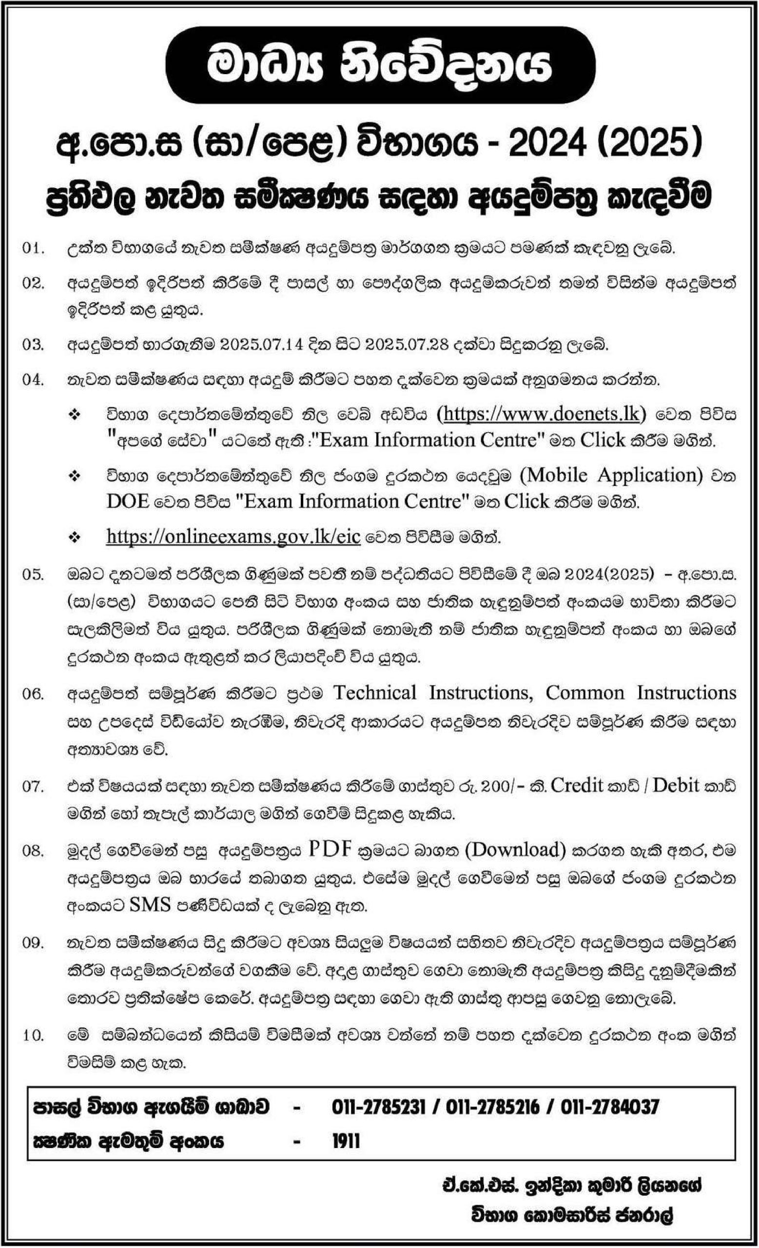 - විභාග දෙපාර්තමේන්තුව විසින් පවත්වනු ලබන 2024 (2025) අ.පො.ස. සාමාන්ය පෙළ විභාගයේ ප්රතිඵල නැවත නිවැරදි කිරීම (නැවත පරීක්ෂා කිරීම) සඳහා අයදුම්පත් කැඳවීම