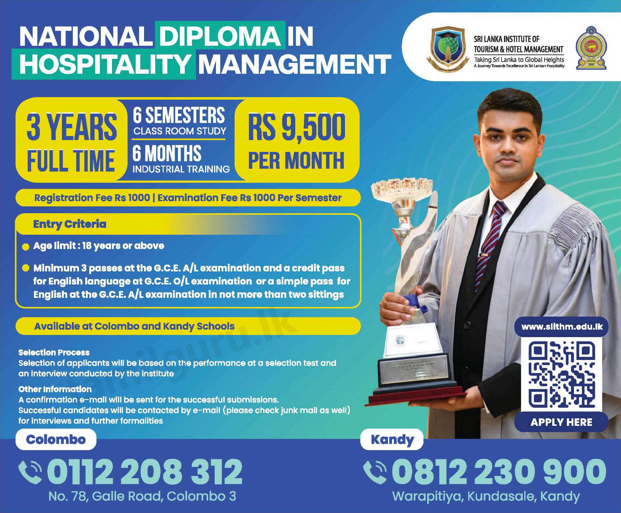 ශ්රී ලංකා සංචාරක සහ හෝටල් කළමනාකරණ ආයතනය (SLITH) විසින් පවත්වනු ලබන සත්කාරක කළමනාකරණය පිළිබඳ ජාතික ඩිප්ලෝමාව (2023 බඳවා ගැනීම) සඳහා අයදුම්පත් කැඳවීම