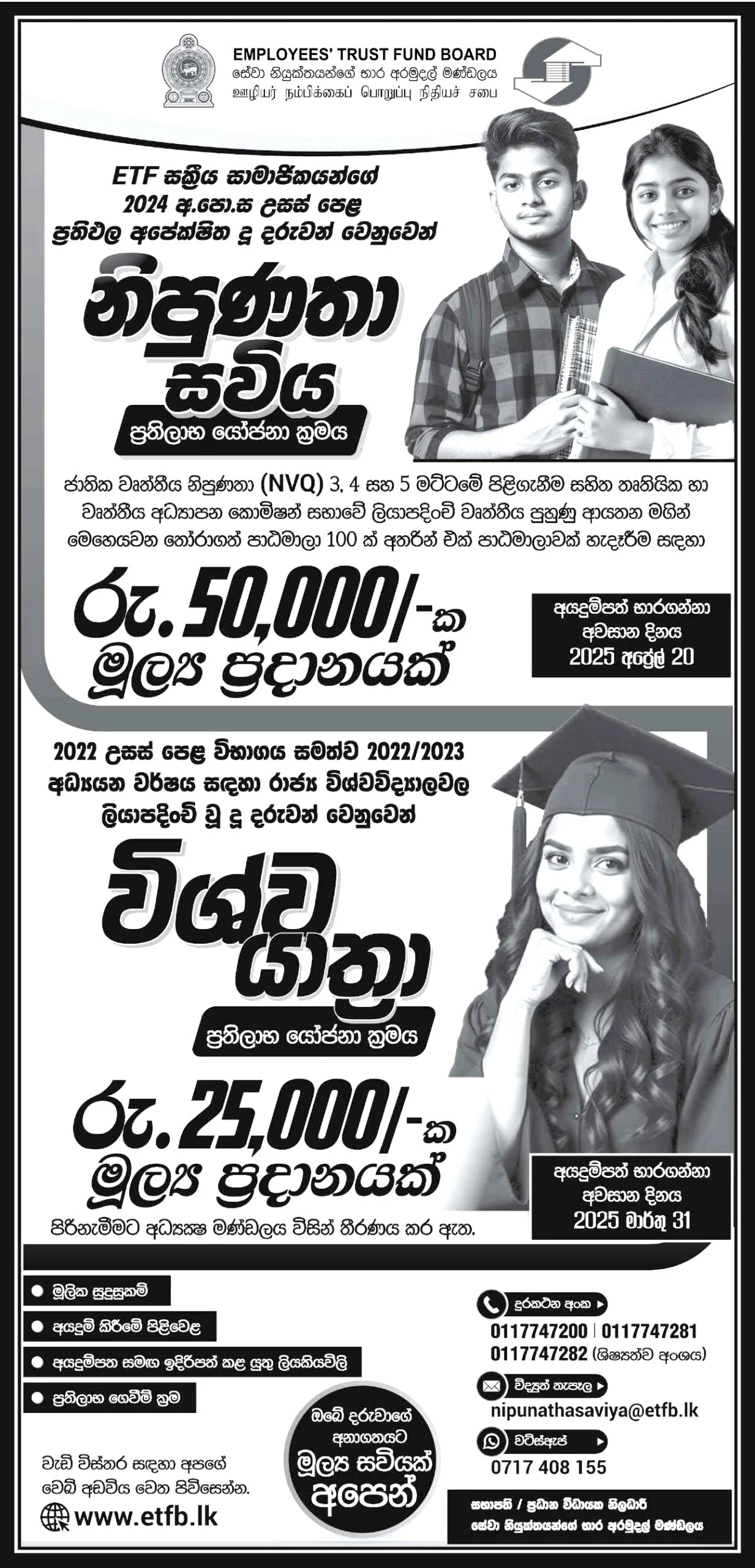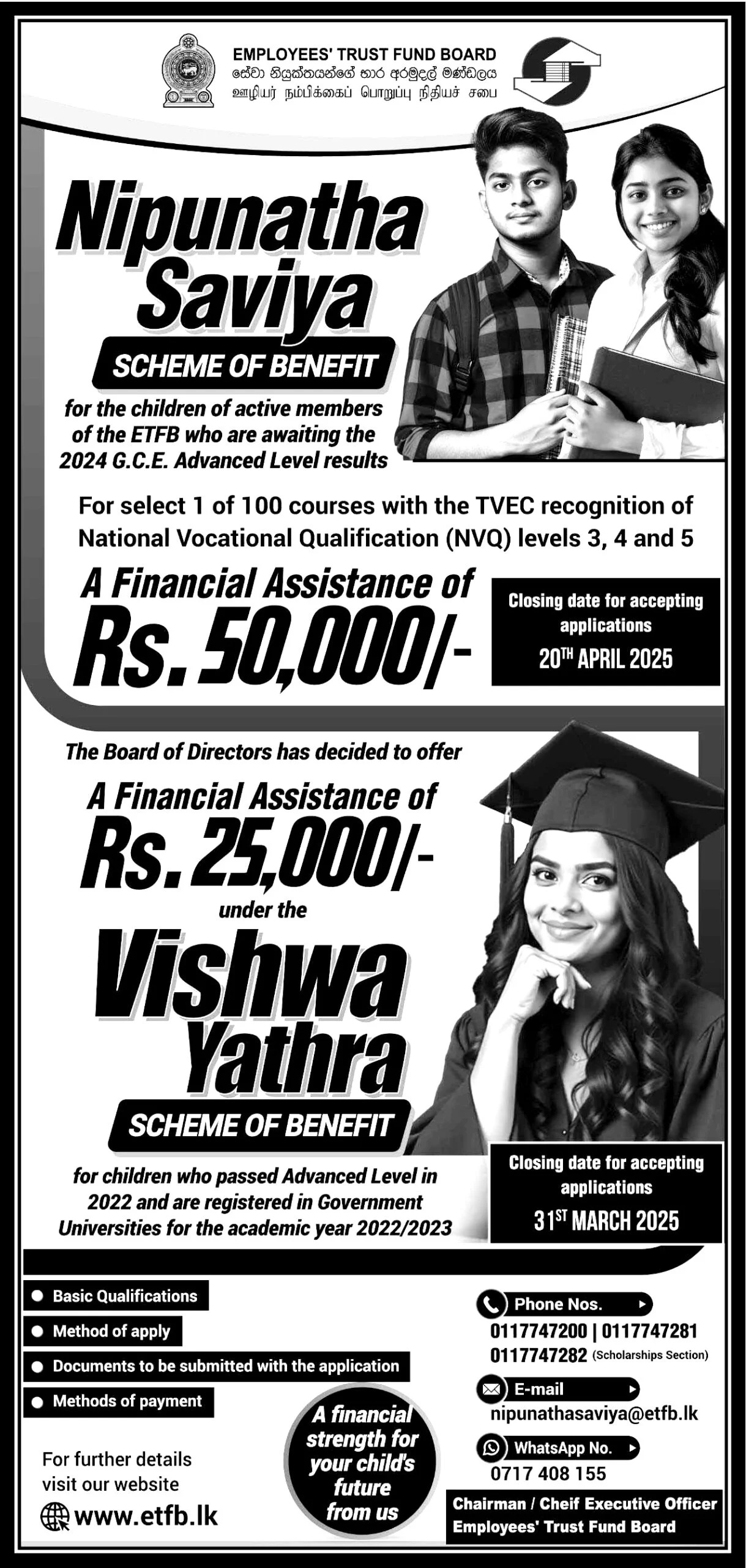 - නිපුණතා සවිය – ජාතික වෘත්තීය සුදුසුකම් (NVQ) මට්ටම් 3, 4 සහ 5 සඳහා TVEC පිළිගැනීමක් සහිත පාඨමාලා 100 න් තෝරාගත් 1 ක් සඳහා ETFB හි ක්රියාකාරී සාමාජිකයින්ගේ දරුවන් සඳහා රු. 50,000/= ක මූල්ය ආධාර