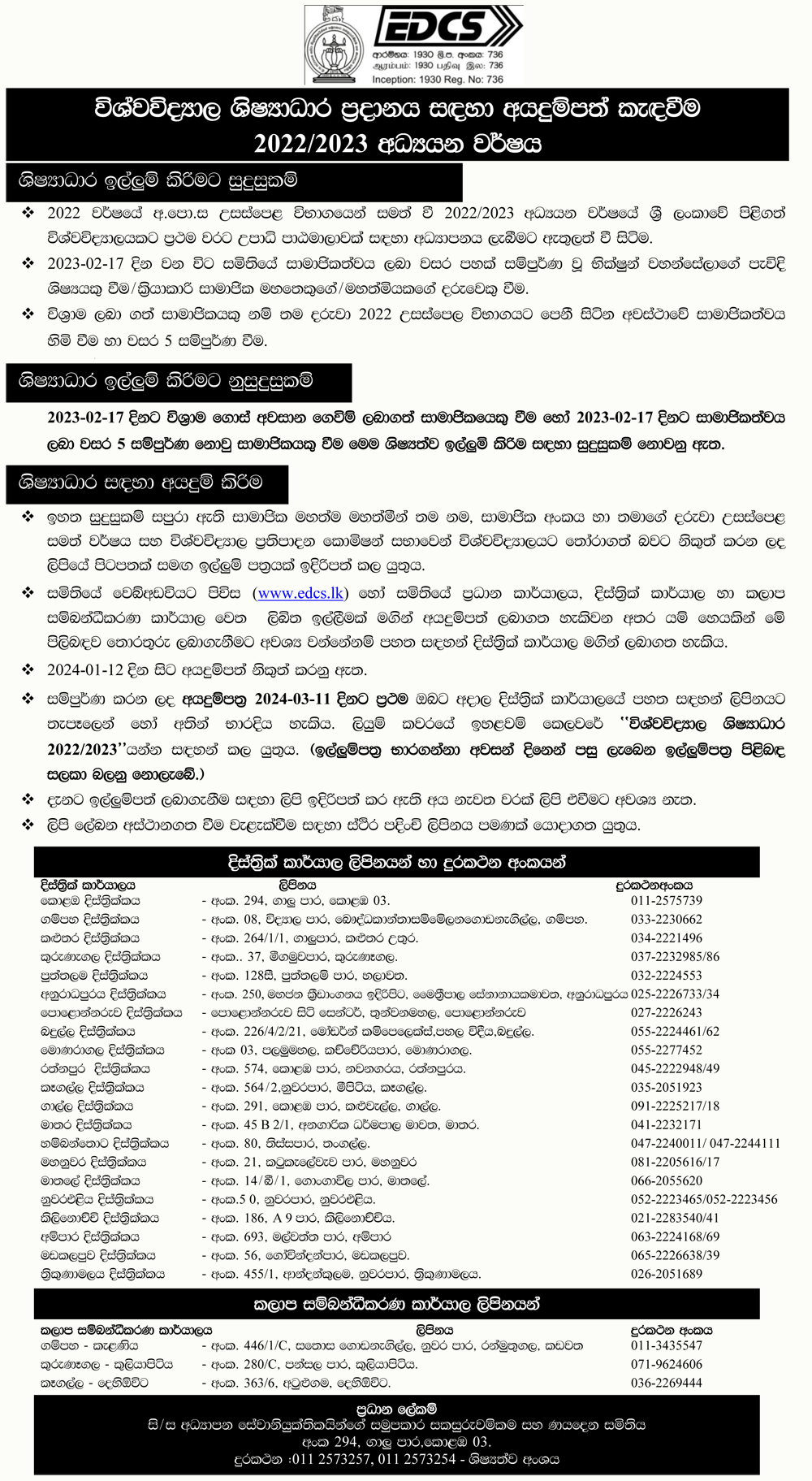 විශ්වවිද්‍යාල ශිෂ්‍යත්ව ප්‍රදානය සඳහා අයදුම්පත් කැඳවීම (අධ්‍යයන වර්ෂය 2022/2023) – අධ්‍යාපන සේවක සමුපකාර සකසුරුවම් සහ ණය සමිතිය (EDCS)