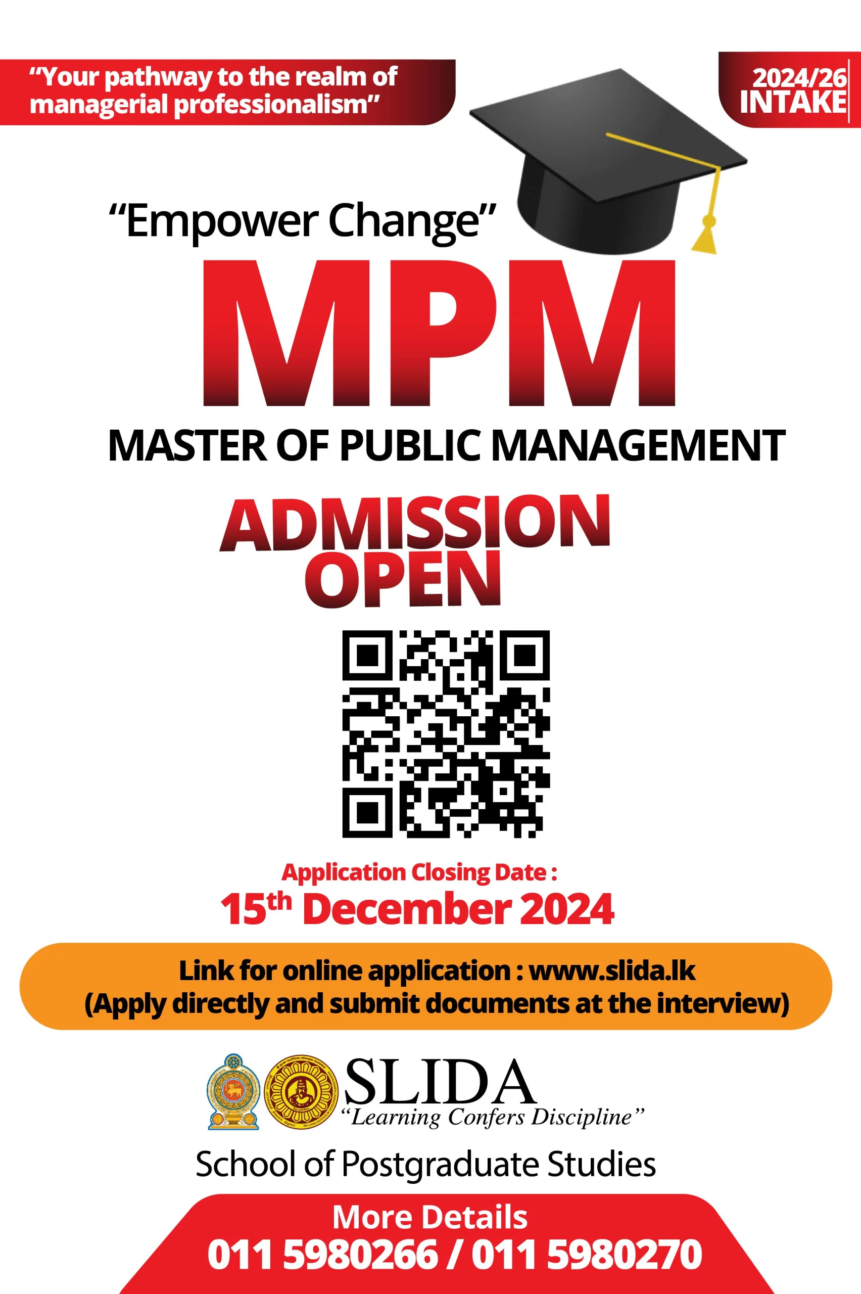 ශ්‍රී ලංකා සංවර්ධන පරිපාලන ආයතනය (SLIDA) විසින් පවත්වනු ලබන Master of Public Management Programme 2024/2026 බඳවා ගැනීම සඳහා අයදුම්පත් කැඳවීම.