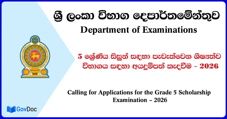 2026 අගෝස්තු මස 09 වන ඉරිදා දින පැවැත්වීමට නියමිත 5 ශ්රේණිය ශිෂ්යත්ව විභාගය සඳහා අයදුම්පත් කැඳවීමේ නිවේදනය විභාග දෙපාර්තමේන්තුව විසින් නිකුත් කර තිබෙනවා.ඊයේ (30) සිට අප්රේල් මස 30 වැනිදා මධ්යම රාත්රී 12.00 දක්වා මෙම අයදුම්පත් කැඳවීම සිදු කරන බවත්, කිසිදු හේතුවක් මත අයදුම්පත් භාර ගන්නා අවසන් දිනය දීර්ඝ නොකරන බවයි විභාග දෙපාර්තමේන්තුව දැනුම් දෙන්නේ.