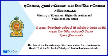 ශ්රී ලංකා විදුහල්පති සේවයේ III ශ්රේණියට බඳවා ගැනීම සඳහා වන සීමිත තරඟකාරී විභාග දිනය දීර්ඝ කෙරේ. 1 month agoAdd comment