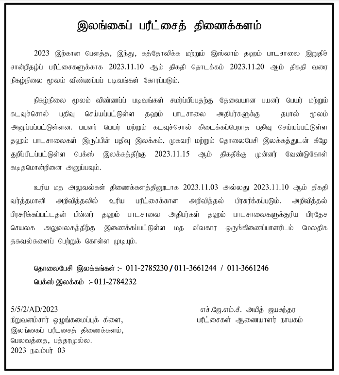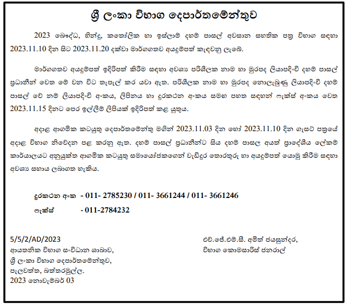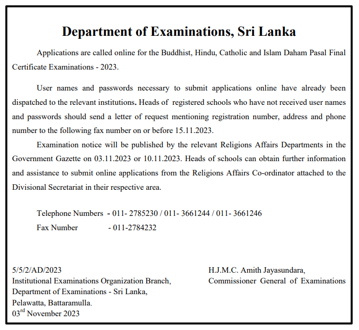 ශ්රී ලංකා විභාග දෙපාර්තමේන්තුව විසින් පවත්වනු ලබන 2023 දහම් පාසල් අවසන් සහතික පත්ර විභාග සඳහා අයදුම්පත් කැඳවීම