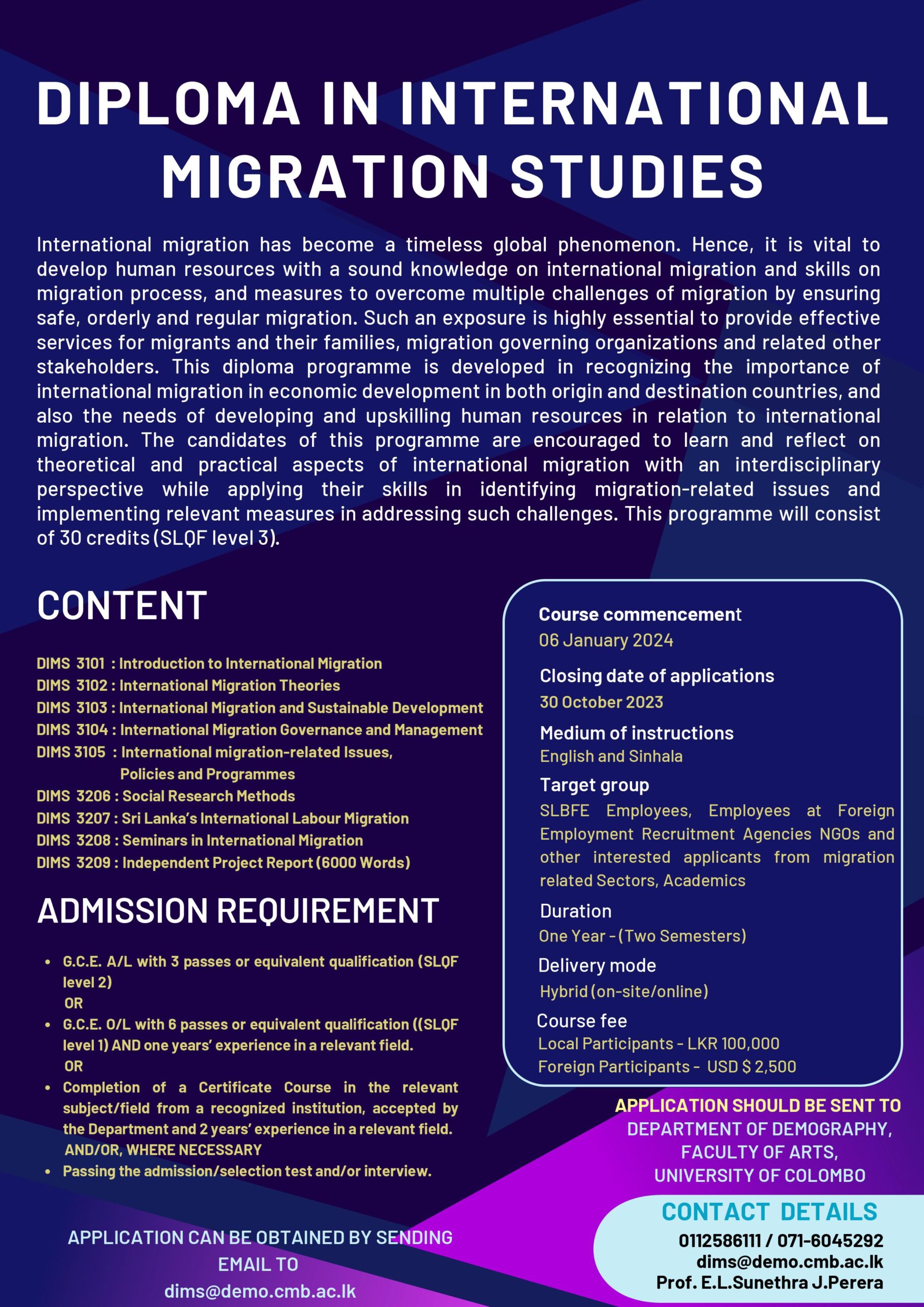 ජාත්යන්තර සංක්රමණ අධ්යයනය පිළිබඳ ඩිප්ලෝමා පාඨමාලා – කොළඹ විශ්වවිද්යාලය