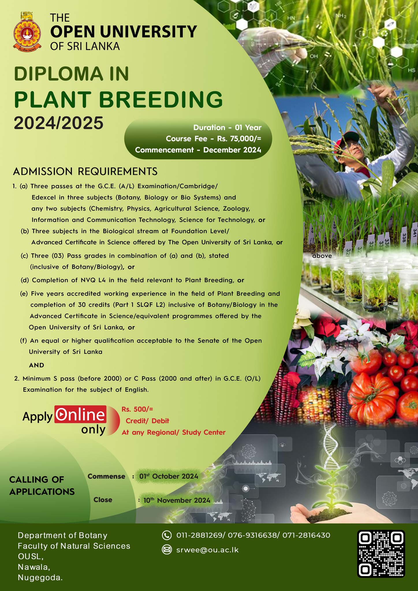 More Details : Diploma in Plant Breeding 2024/25 – Open University of Sri Lanka