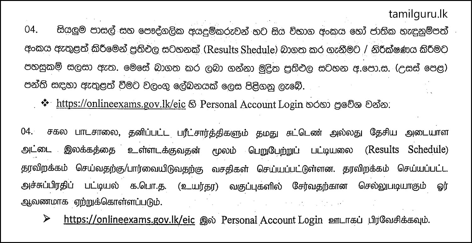 මෙම ප්රතිඵල කාලසටහන අයදුම්කරුවෙකුගේ සමත්/අසමත් තත්ත්වය පිළිබඳ මූලික සාක්ෂියක් ලෙස පිළිගත හැකිය. මෙම විභාගයේ මුල් සහතිකය ශ්රී ලංකාවේ විභාග දෙපාර්තමේන්තුවෙන් අයදුම් කළ යුතුය