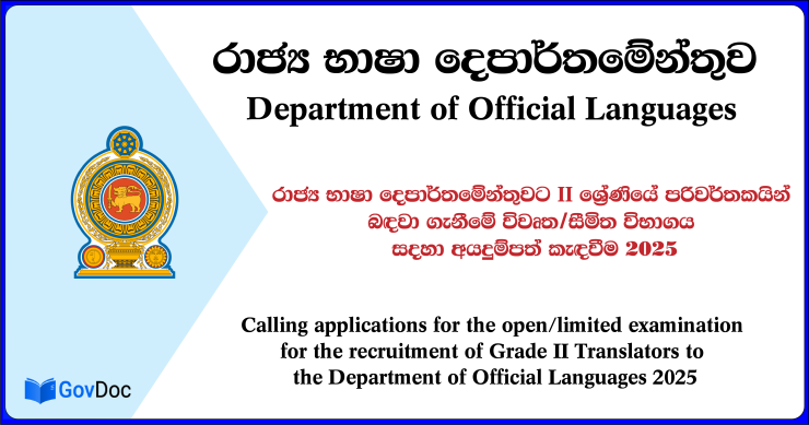 අයදුම්පත් කැඳවීම – රාජ්ය භාෂා දෙපාර්තමේන්තුවට II පන්තියේ (සිංහල/ඉංග්රීසි), (සිංහල/දෙමළ) සහ (දෙමළ/ඉංග්රීසි) පරිවර්තකයින් බඳවා ගැනීම සඳහා වන විවෘත/සීමිත විභාගය – 2025.