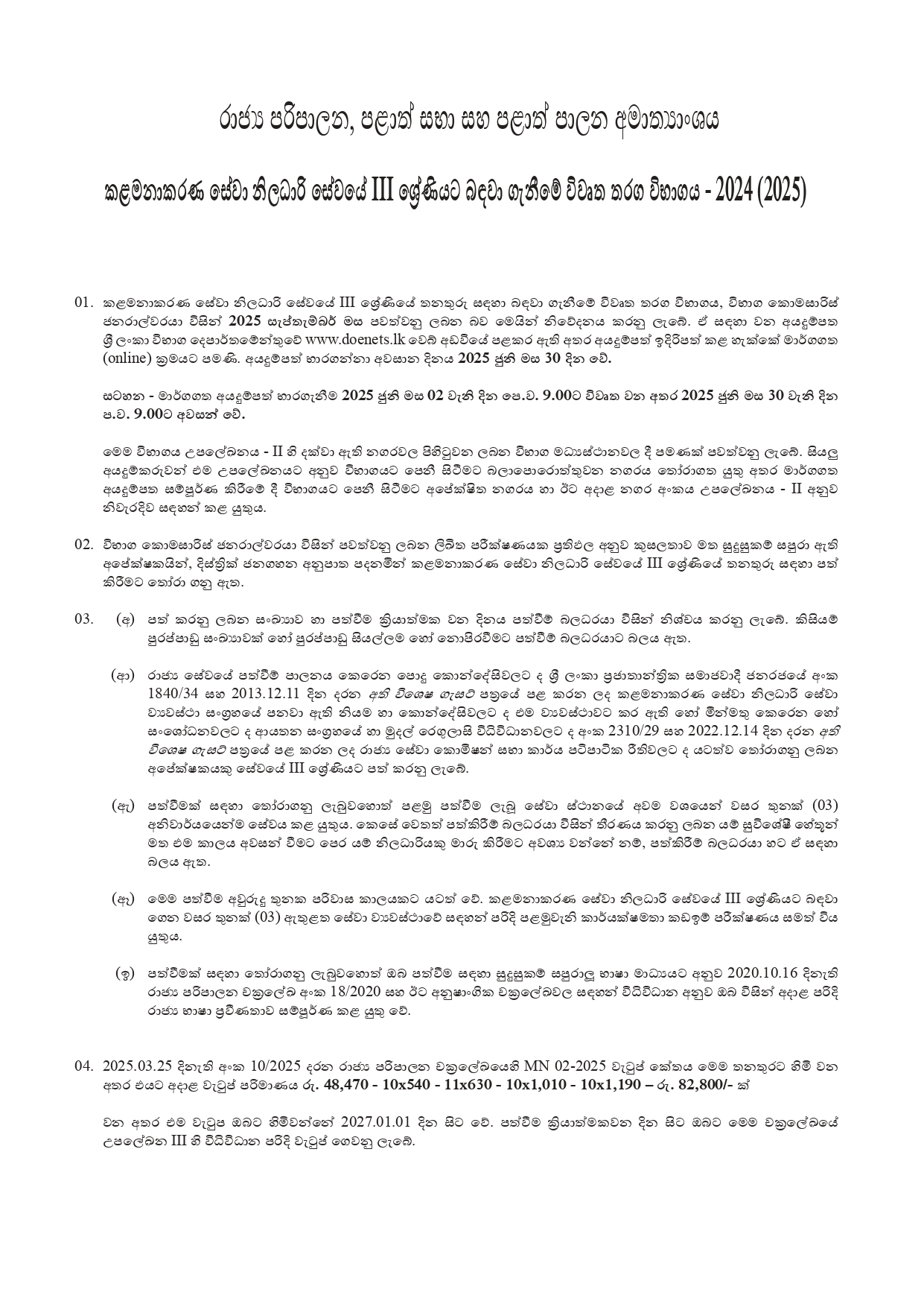 කළමනාකරණ සේවා නිලධාරි සේවයේ III ශ්රේණියේ තනතුරු සඳහා බඳවා ගැනීමේ විවෘත තරග විභාගය, විභාග කොමසාරිස් ජනරාල්වරයා විසින් 2025 සැප්තැම්බර් මස පවත්වනු ලබන බව මෙයින් නිවේදනය කරනු ලැබේ. ඒ සඳහා වන අයදුම්පත ශ්රී ලංකා විභාග දෙපාර්තමේන්තුවේ www.doenets.lk වෙබ් අඩවියේ පළකර ඇති අතර අයදුම්පත් ඉදිරිපත් කළ හැක්කේ මාර්ගගත (online) ක්රමයට පමණි. අයදුම්පත් භාරගන්නා අවසාන දිනය 2025 ජුනි මස 30 දින වේ.