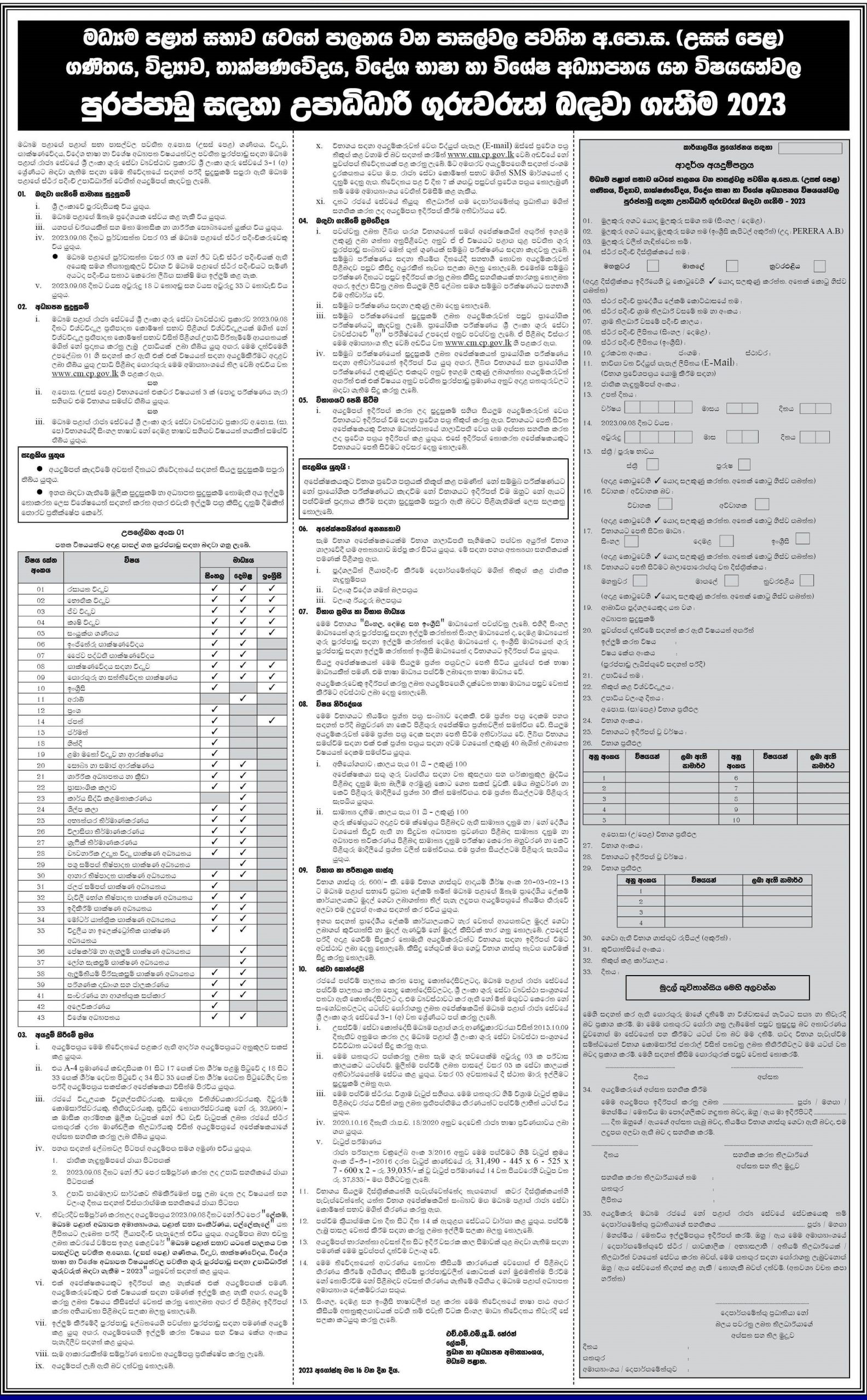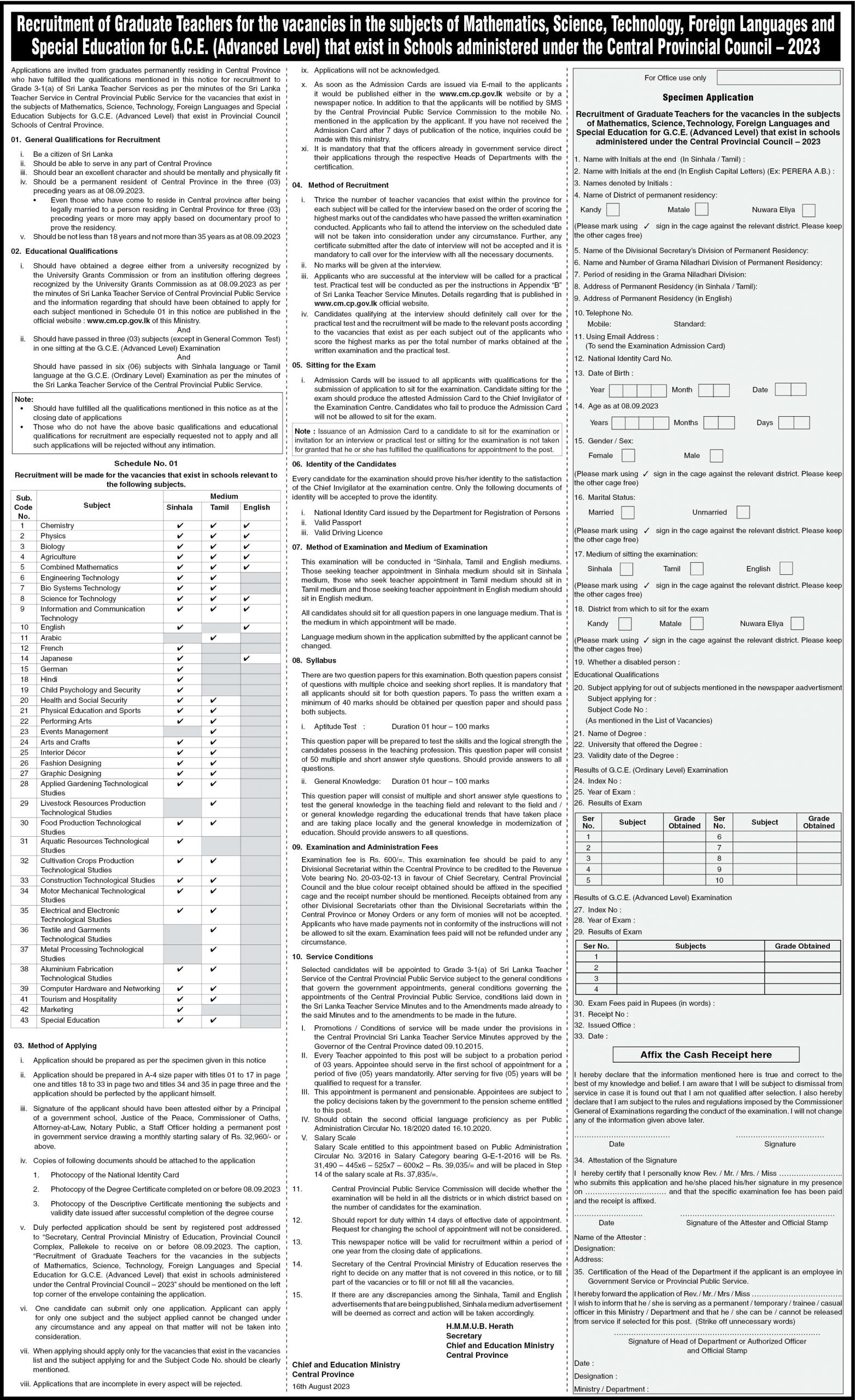 මධ්‍යම පළාතේ පළාත් සභා පාසල්වල පවතින අ.පො.ස (උ.පෙළ) ගණිතය විද්‍යාව තාක්ෂණවේදය භාෂා හා විශේෂ අධ්‍යාපන විෂයයන්වල පවතින පුරප්පාඩු සදහා මධ්‍යම පළාත් රාජ්‍ය සේවයේ ශ්‍රි ලංකා ගුරු සේවා ව්‍යවස්ථාව ප්‍රකාරව ශ්‍රි ලංකා ගුරු සේවයේ 3-1 (අ) ශ්‍රේණියට බදවා ගැනීම සදහා මෙම නිවේදනයේ සදහන් පරිදි සපුරා අැති මධ්‍යම පළාතේ ස්ථිර පදිංචි උපාධිධාරින් වෙතින් අයදුම්පත් කැදවනු ලබයි..