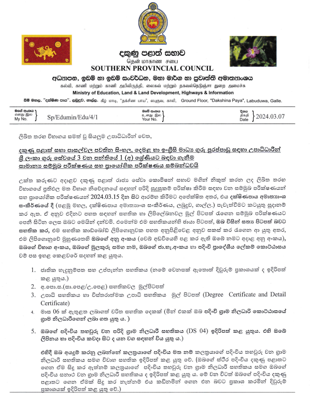 දකුණු පළාත් සභා පාසල්වල පවතින සිංහල, දෙමළ හා ඉංග්රීසි මාධ්ය ගුරු පුරප්පාඩු සඳහා උපාධිධාරීන් ශ්රී ලංකා ගුරු සේවයේ 3 වන පන්තියේ 1 (අ) ශ්රේණියට බඳවා ගැනීම සාමාන්ය සම්මුඛ පරීක්ෂණය සහ ප්රායෝගික පරීක්ෂණය සම්බන්ධ නිවේදනය