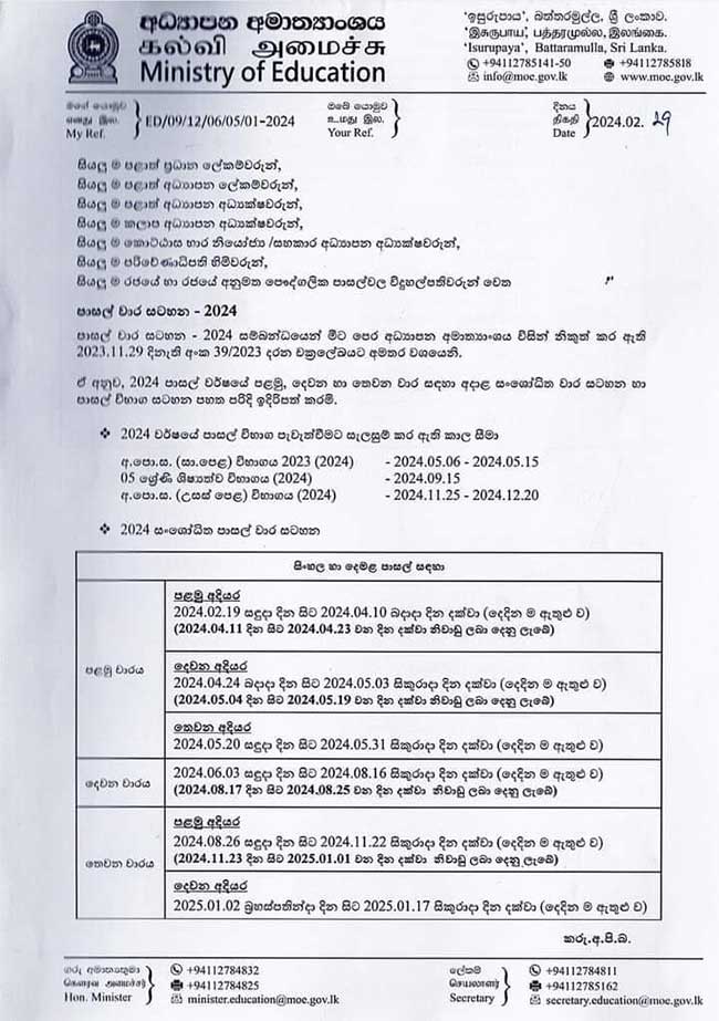 - 2024 වර්ෂයේ සංශෝධිත පාසල් වාර සටහන අධ්යාපන අමාත්යංශය විසින් ප්රකාශයට පත් කර තිබෙනවා.
