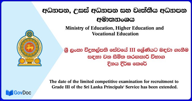 ශ්රී ලංකා විදුහල්පති සේවයේ III ශ්රේණියට බඳවා ගැනීම සඳහා වන සීමිත තරඟකාරී විභාග දිනය දීර්ඝ කෙරේ.
