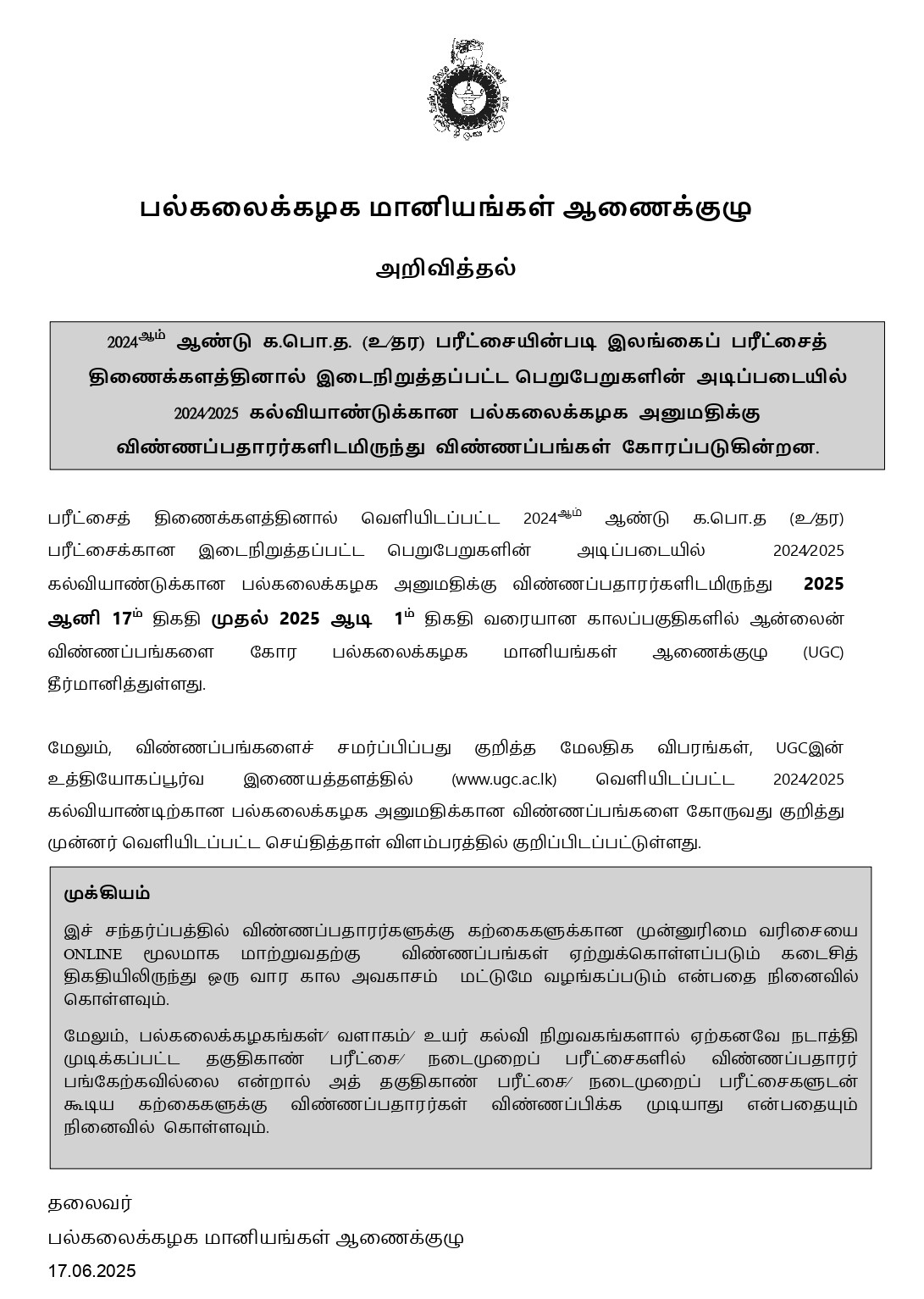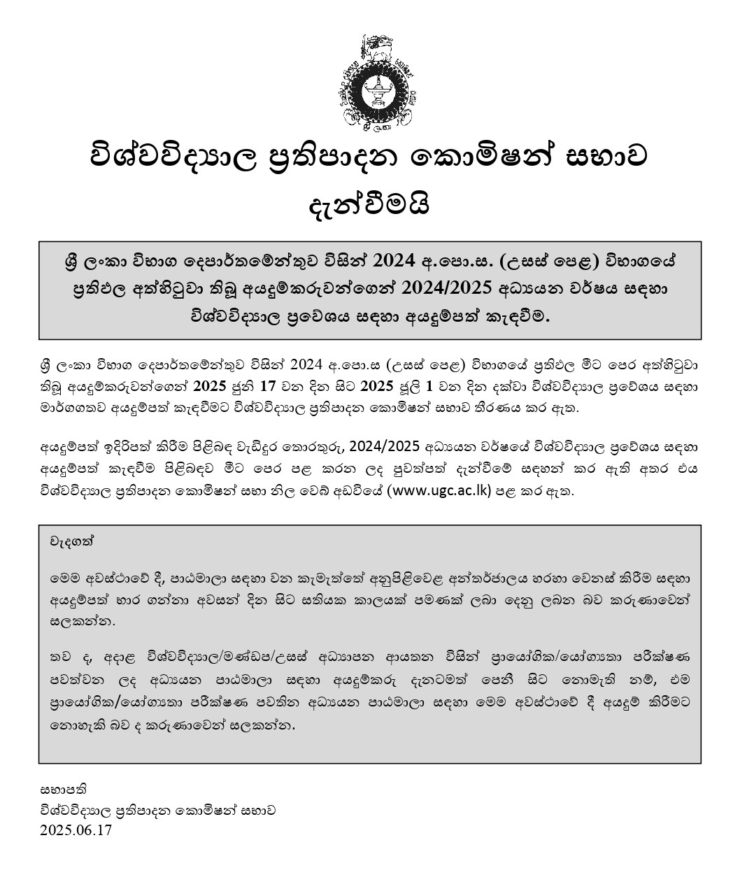 2024 අ.පො.ස (උසස් පෙළ) විභාගයේ ප්‍රතිඵල ශ්‍රී ලංකා විභාග දෙපාර්තමේන්තුව විසින් අත්හිටුවා ඇති අයදුම්කරුවන්ගෙන් 2024/2025 අධ්‍යයන වර්ෂය සඳහා විශ්වවිද්‍යාල ප්‍රවේශය සඳහා අයදුම්පත් කැඳවීම.